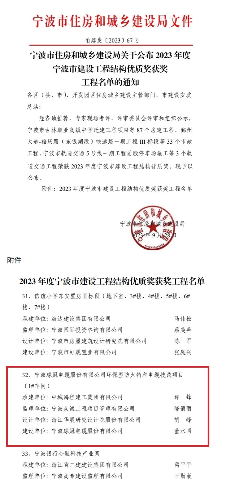 近日,宁波市住房和城乡建设局公布了《2023年度宁波市建设工程结构优质奖》项目名单,众诚工程公司监理的“宁波球冠电缆股份有限公司环保型防火特种电缆技改项目 (1#车间)”工程榜上有名。