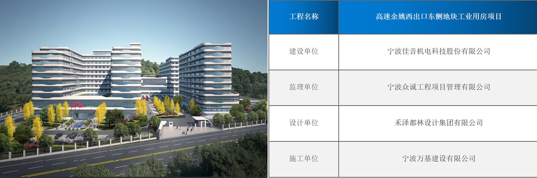 高速余姚西出口东侧地块工业用房项目位于浙江省宁波市余姚市兰江街道夏巷村,是我市知名企业宁波佳音机电科技股份有限公司的工业厂房,本项目总投资60387.33万元,总建筑面积130086.81平方米;其中地下室总建筑面积为6395.23平方米,1#、2#、3#厂房均为框架结构,1#厂房主要分为A、B、C三个区块,A区和B区均为7层;C区五层,建筑面积为74661.02平方米。2#厂房框架10层,建筑面积为31514.24平方米。3#厂房框架10层,建筑面积为14634.02平方米。