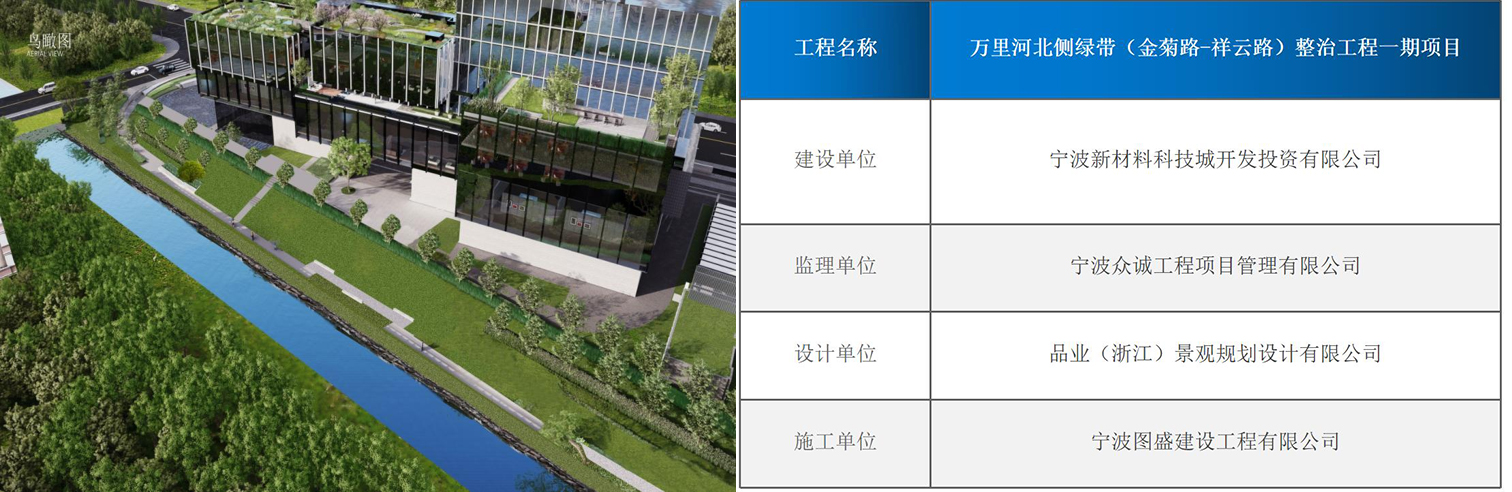 工程位于宁波国家高新区,主要建设内容包括对万里河北侧沿河步道、绿化、照明、监控及河坎的建设,面积约为2488平方米,长度约为175米,总投资约为200万元。