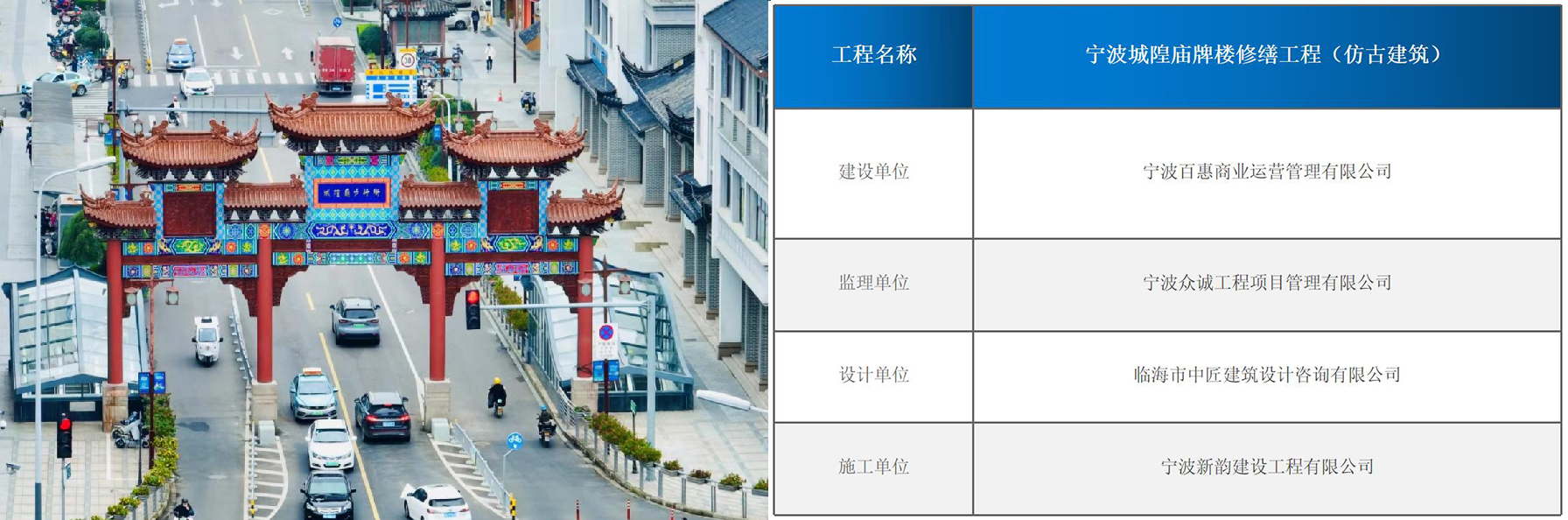 工程位于宁波市城隍庙开明街与药行街交叉口,作为汉族特色建筑,是宁波市标志性建筑和门户,牌楼整体南北向,四柱三开间,总长20米,高12.5米。修缮后的城隍庙牌坊浮雕精工细琢,斗拱层叠,檐角飞翘,彩绘图案色彩亮丽、刻画精美,四根朱红色的立柱明亮可鉴、气势恢弘,匾额上的“国泰民安”四个字寄托了对这座城市的美好祝愿。